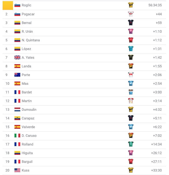 El esloveno Tadej Pogacar, arrebató el segundo puesto al colombiano Egan Bernal, los colombianos entraron a 16″ Miguel Ángel López; a 38″ Egan Bernal y Rigoberto Urán; y a 40″ Nairo Quintana.