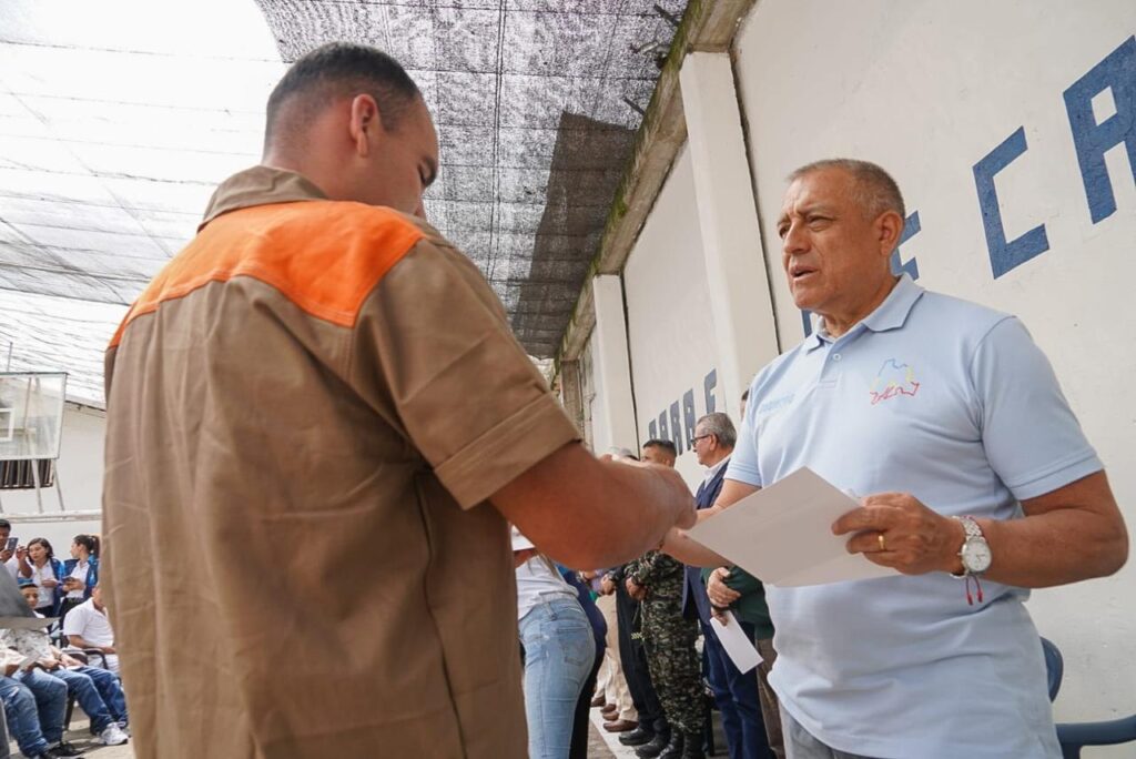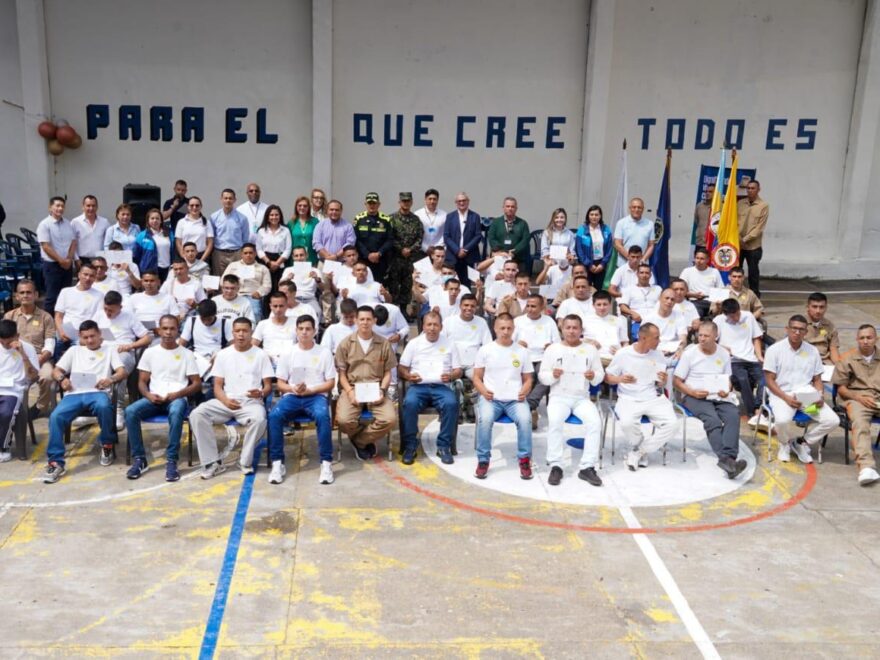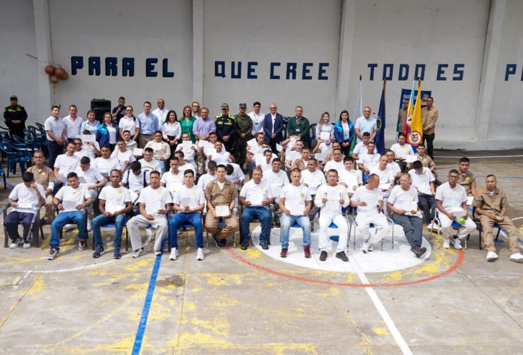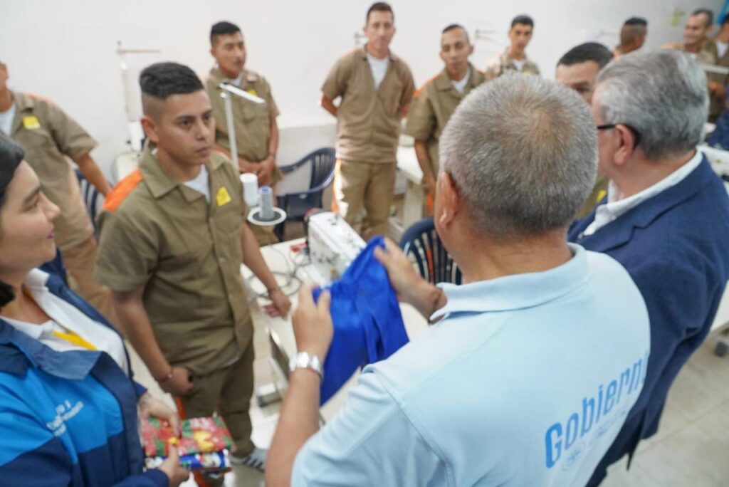 (Cundinamarca, diciembre 19 de 2025). “Entregamos el taller de confecciones y certificamos a 56 personas privadas de la libertad, con 99 títulos otorgados por el SENA. Estas acciones buscan reducir la reincidencia, que supera el 26 %, fortalecer la seguridad del departamento, y promover la resocialización e inclusión social”, dijo el general Luis Fernando Navarro, secretario de Gobierno y Seguridad Ciudadana del departamento.