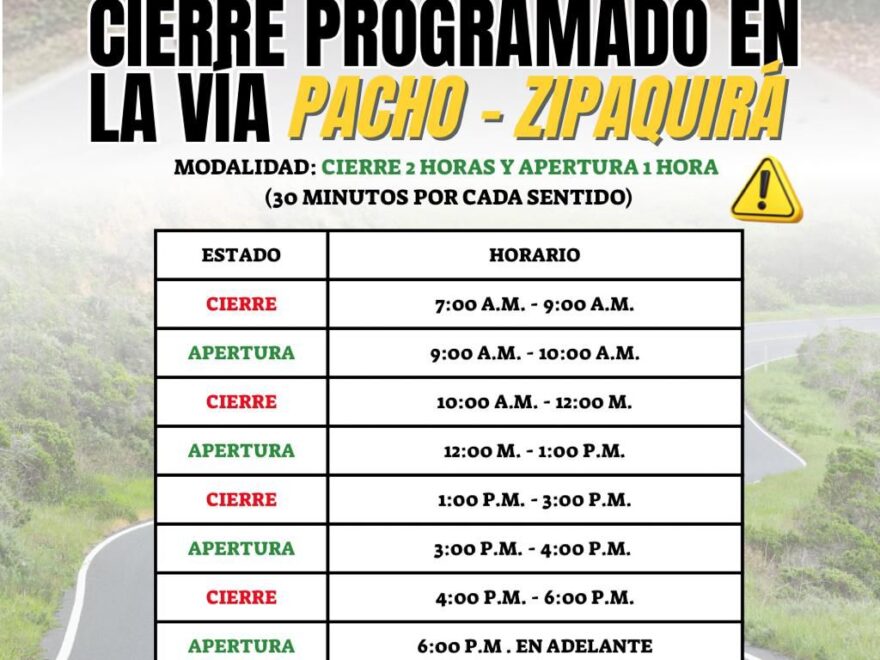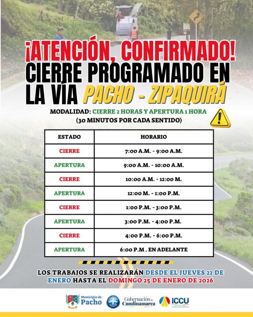 La Administración Municipal informa a la comunidad que, una vez finalizado el mantenimiento de la máquina asfaltadora, SE HA PROGRAMADO Y CONFIRMADO con el ICCU la continuación de la intervención vial a partir del día de mañana en el corredor de la vía Pacho – Zipaquirá.