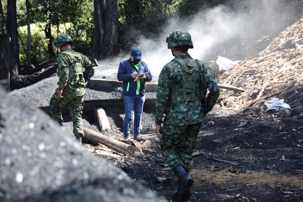 • En el lugar se identificaron 3 pilas en plena combustión, dos depósitos de retal de madera, trozas de especies como acacia y eucalipto y 98 bultos de carbón listos para su distribución comercialización.